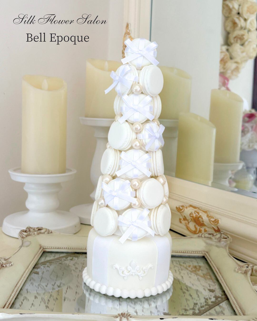 アイボリーの大マカロンにふんだんにパールをあしらった7段マカロンタワーです。